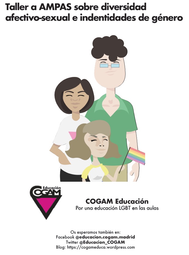 Desde esta asociación ofrecen a las ASOCIACIONES DE MADRES Y PADRES un taller sobre diversidad afectivo sexual y prevención del acoso escolar por homofobia. Este grupo lleva 20 años realizando esta misma actividad en las aulas de institutos de Secundaria por toda la comunidad de Madrid, y desde hace unos años han decidido extender su acción educativa a las familias, con el objetivo de resolver posibles dudas, facilitar el conocimiento sobre una serie de conceptos y dar unos consejos de actuación, a la hora de abordar estas cuestiones con nuestros hijos e hijas.