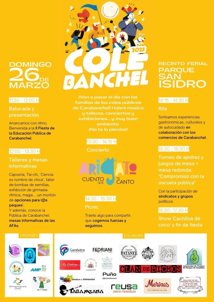 Las AFA (Asociaciones de Familias y Alumnado) y AMPA (Asociaciones de Madres, Padres y Alumnado) de los Centros Públicos de Carabanchel, nos unimos para celebrar que LA PÚBLICA MOLA MÁS. Ya esta todo organizado y esperamos contar con todos vosotros para pasarlo en grande. Este año hay muchas novedades, muchos talleres, conciertos, mesas redondas durante todo el día. No olvides leer el programa y sobre todo ubicar bien el recinto de la Feria de San Isidro.
